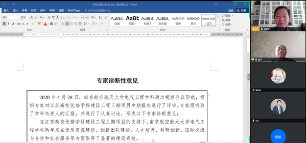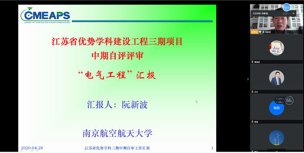 2020年4月28日上午,南京航空航天大学组织专家对江苏高校优势学科建设工程三期项目电气工程学科进行了中期评审。评审会通过视频会议形式进行,评审专家组组长由河海大学鞠平教授担任,专家有浙江大学何湘宁教授,西安交通大学杨旭教授,东南大学花为教授和中国矿业大学陈昊教授。蜜桃视频 电气工程系阮新波教授、胡海兵教授和曹瑞武副教授参加汇报。