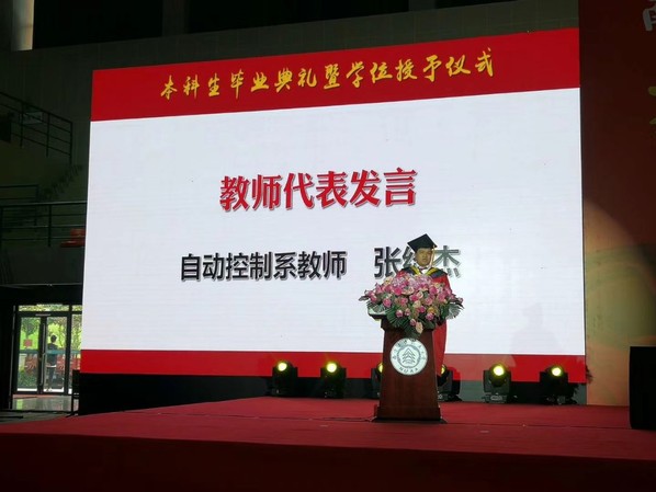 在教师代表发言环节,自控系张绍杰老师代表蜜桃视频 全体教师发言。他希望大家要养成终身学习的习惯,要不忘初心,永葆情怀,要养成良好的习惯,保持身心健康。