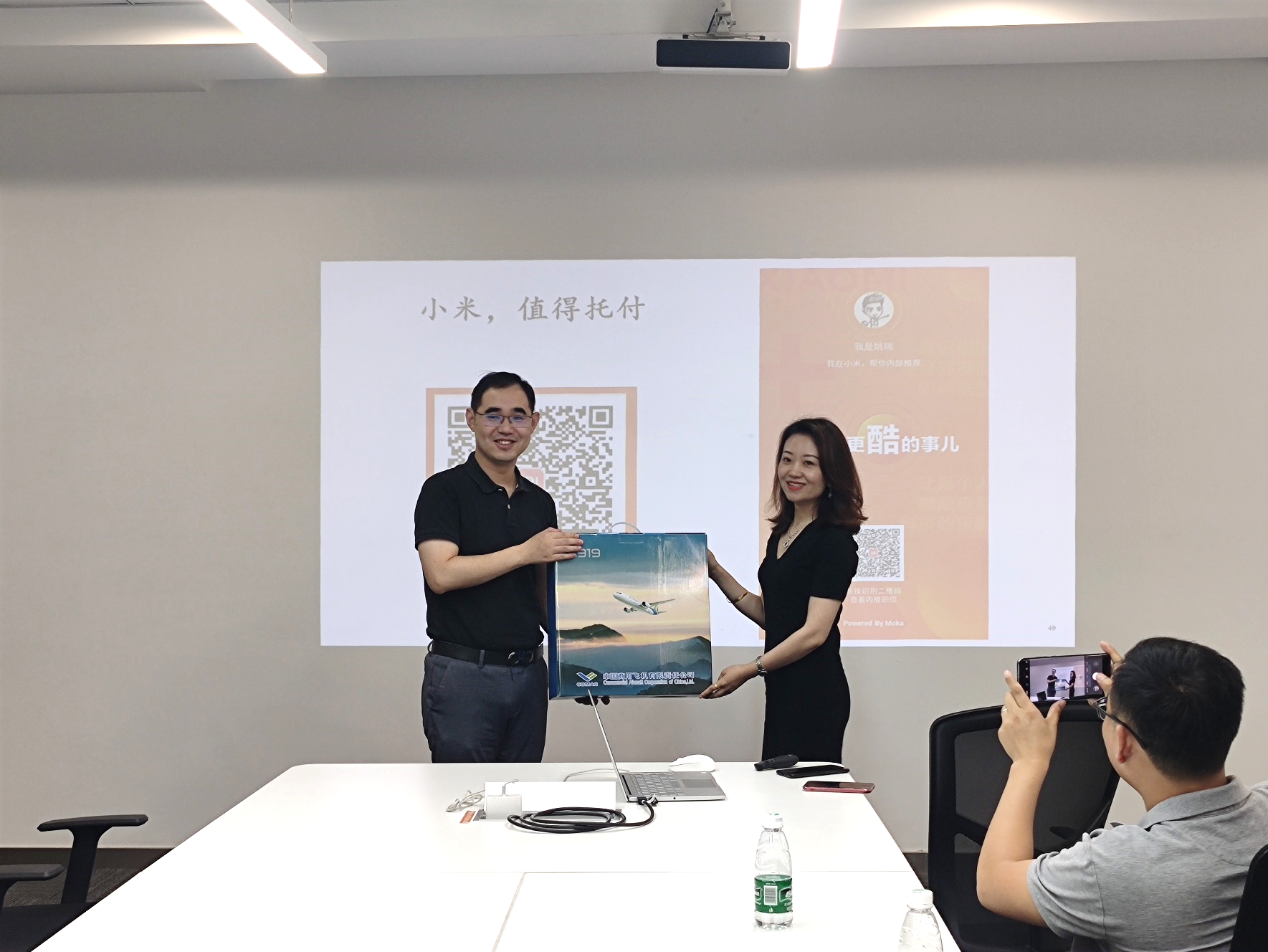 小米科技有限责任公司是一家专注于智能硬件和电子产品研发的全球化移动互联网企业。在人力资源总监张蕴等人的带领下,师生们首先参观了小米的员工办公区域包括运动设施,聊天沙发、免费饮料等。接着在会议室观看了小米公司的宣传片,人事总监张蕴介绍了小米集团的发展历程和价值观及其应届生培养计划,并欢迎南航毕业生来小米就职。最后,作为南航校友的王琪和姚瑞两位师兄,和同学们分享了他们入职以后的感受。人事总监也针对在座同学的求职疑问进行了一一解答。同学们听后都表示受益匪浅,对小米的蜜桃视频有了更进一步的认识。活动结束之际,蜜桃视频 党委副书记张跃书记向南京小米赠送了由南航校友参与设计的国产大飞机C919模型一台,象征着南航蜜桃视频 与南京小米的友谊,也祝福南京小米蒸蒸日上。
