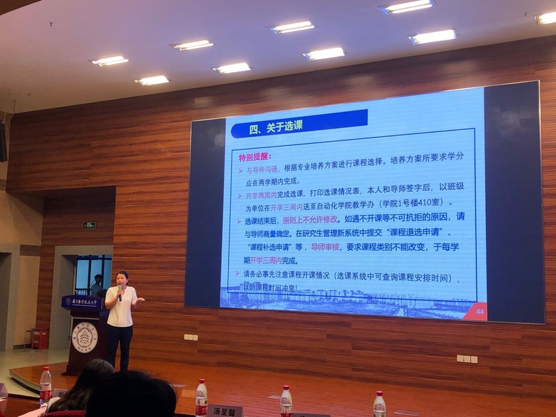 接着,院教务员王元娟老师详细介绍了研究生的教育教学事项,带领同学们共同学习南京航空航天大学研究生手册,并为同学们解答了关于培养方案、学分要求、选课步骤、基金课题申报等各方面的问题。