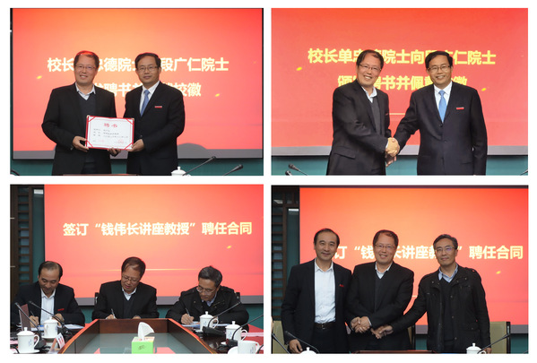 授聘仪式现场,校长单忠德为段广仁院士颁发聘书佩戴校徽,并签订了“钱伟长讲座教授”聘任合同。