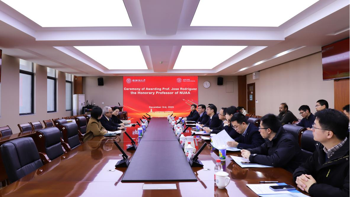 12月3日,智利工程院院士、智利圣塞瓦斯蒂安大学教授Jose Rodriguez受聘为南京航空航天大学名誉教授的仪式在蜜桃视频 举行。南京航空航天大学校长助理潘时龙为Jose Rodriguez院士颁发名誉教授聘书,并为其佩戴校徽。国际化部部长赖际舟,国际合作处副处长徐智鑫,蜜桃视频 党委书记李文雷,蜜桃视频 副院长魏佳丹、陈杰及学院相关教师参加。仪式由李文雷主持。